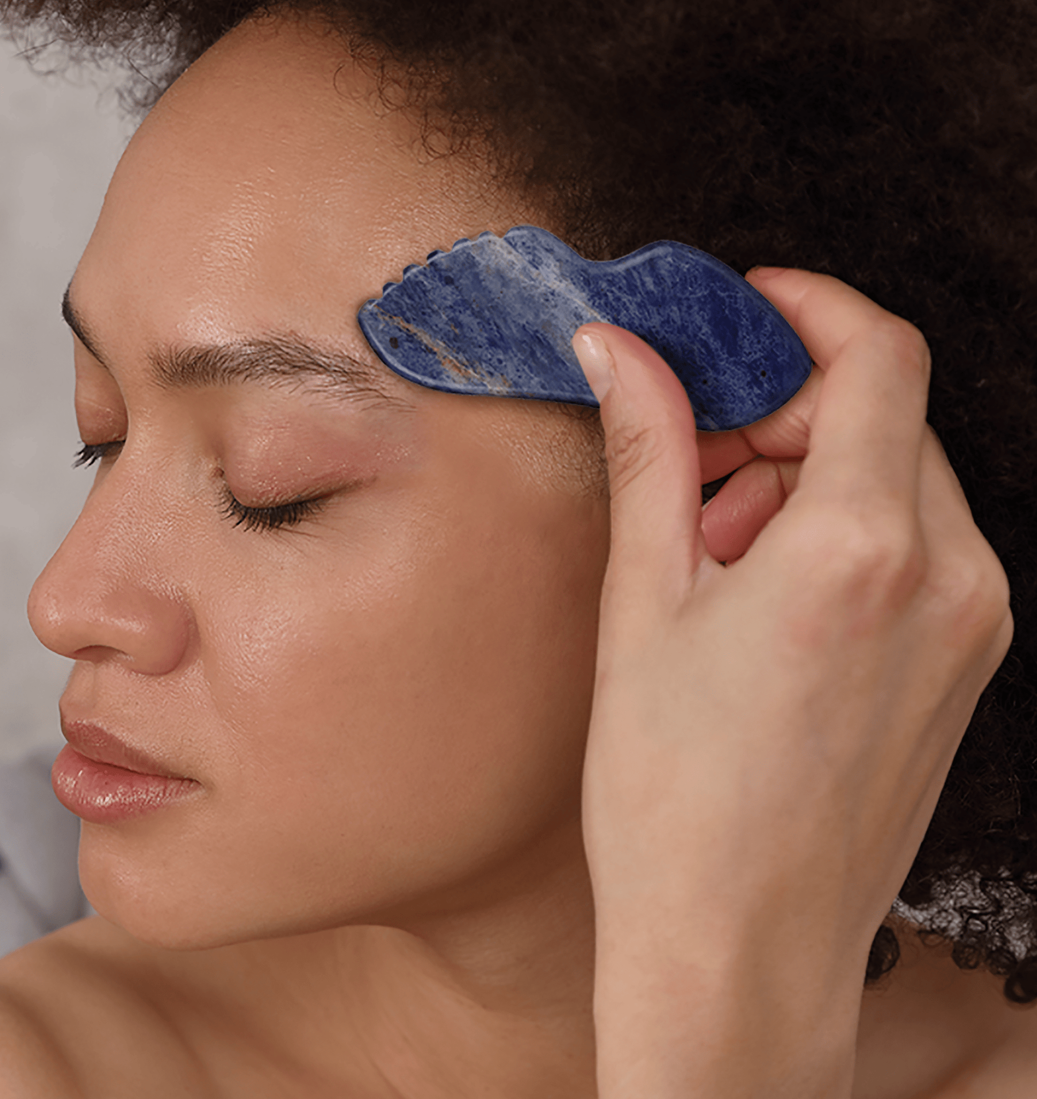 Sodalite simulates the third eye chakra, a spiritually opening chakra which commands the energy flow within the body. It also encourages deep journeying, so is ideal for Zone Face Lift. So, beyond the physical function of the shape and techniques used in gua sha sodalite naturally calms the heart and mind to enhance energy giving your mind the power to think and function.